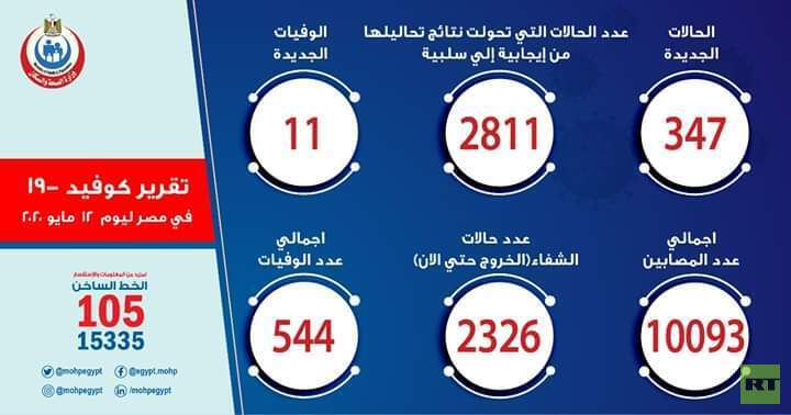 وذكر مجاهد أن إجمالي العدد الذي تم تسجيله في مصر بفيروس كورونا المستجد حتى اليوم، الثلاثاء، هو 10093 حالة من ضمنهم 2326 حالة تم شفاؤها وخرجت من مستشفيات العزل والحجر الصحي، و 544 حالة وفاة.