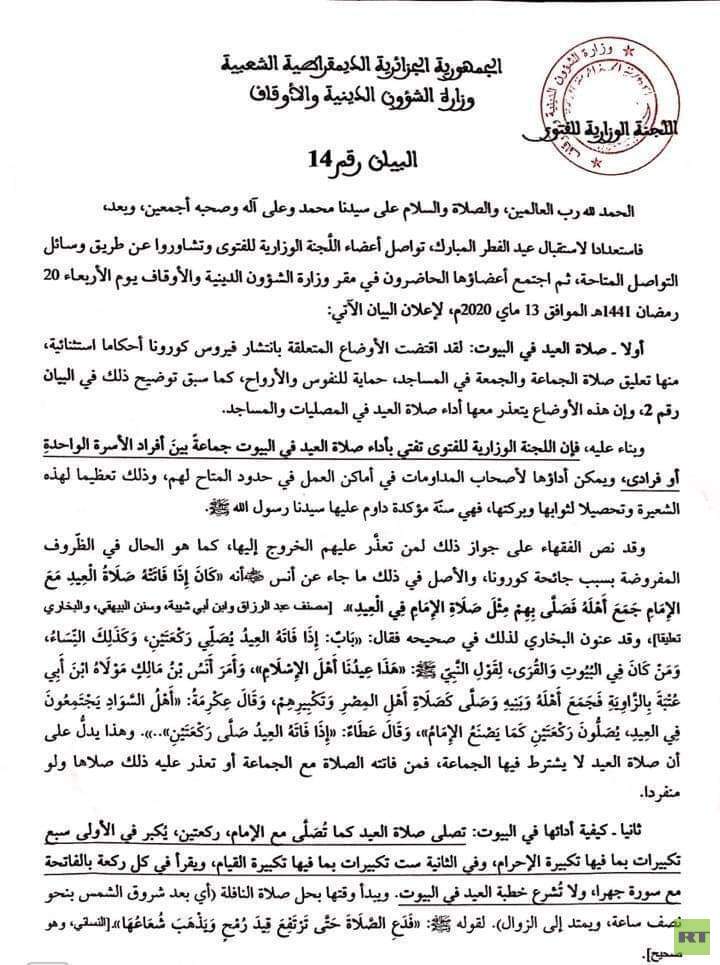 أصدرت اللجنة الوزارية للفتوى التابعة لوزارة الشؤون الدينية في الجزائر اليوم الأربعاء، فتوى حول صلاة العيد.