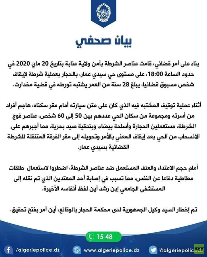 وقالت مصالح أمن ولاية عنابة في البيان يوم الأربعاء، إنه "بناء على أمر قضائي، قامت قوات الأمن في حدود الساعة 18 مساء بحي سيدي عمار بالحجار لإيقاف مفتش عنه 28 سنة في عمره".