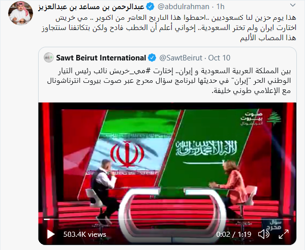 سخر الأمير عبد الرحمن بن مساعد بن عبد العزيز من نائبة رئيس التيار الوطني الحر اللبنانية مي خريش، عقب تفضيلها إيران على السعودية في حديث متلفز.