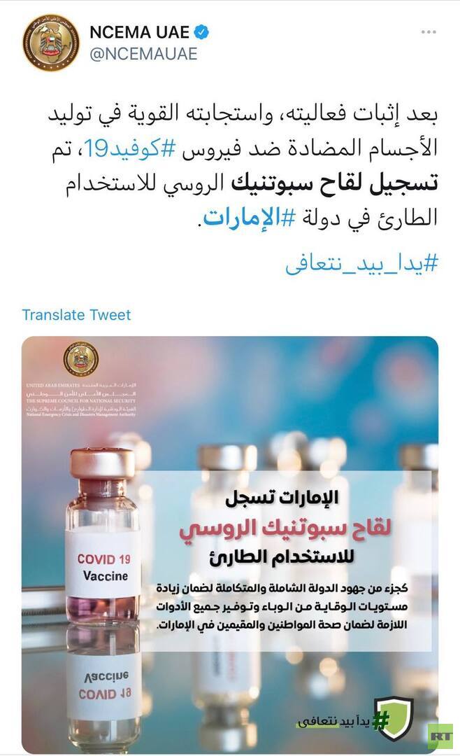 وقالت وزارة الصحة ووقاية المجتمع الإماراتية إن تسجيل لقاح "سبوتنيك V" الروسي "يأتي ضمن جهود الدولة لتوفير جميع الأدوات اللازمة لضمان صحة المواطنين والمقيمين في الإمارات".