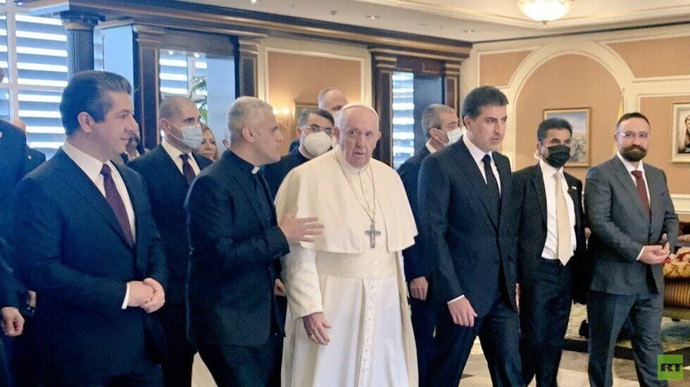 وقال مراسل RT، إن "البابا استقبل بشكل رسمي في مطار أربيل من قبل رئيس الإقليم نيجرفان بارزاني، ورئيس حكومة الإقليم مسرور بارزاني".