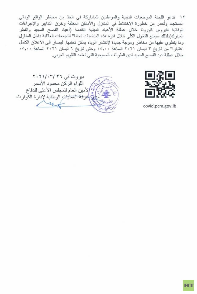لبنان يعلن عن إجراءات الإغلاق خلال عطلة عيدي الفصح والفطر