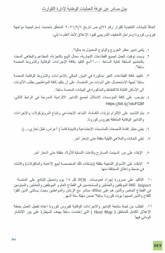 – يمدد توقيت العمل لجميع القطاعات التجارية، محال البيع بالتجزئة، المطاعم والمقاهي المحدد بالتعاميم السابقة، لغاية الساعة 21:00، مع التقيد بالإجراءات الوقائية كافة والشروط المعممة.