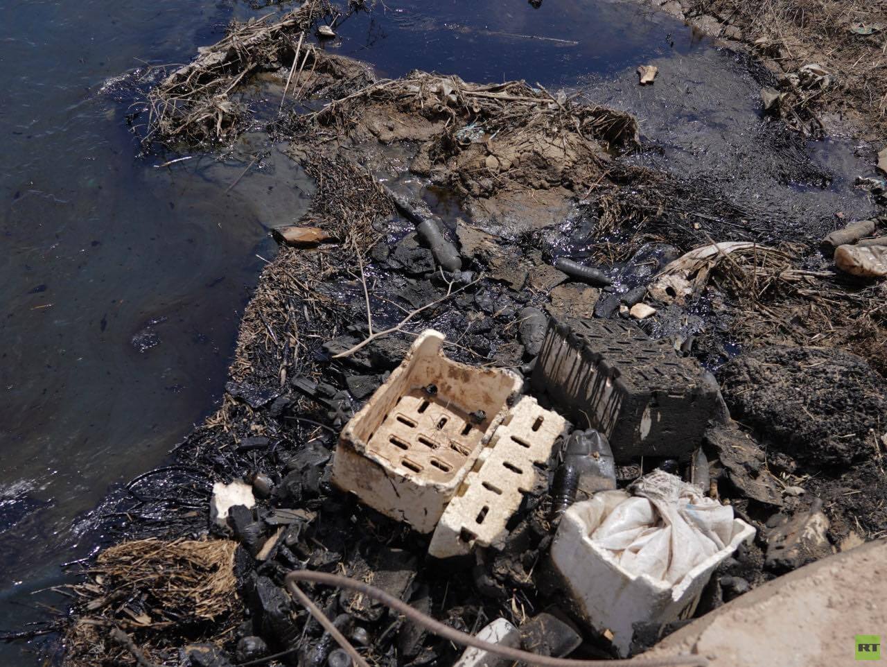 في قرية طاش قرب الحدود العراقية السورية التقطت كاميرا RT صورا لتلوث نهر الرميلة في جنوب منطقة الرميلان الغنية بالنفط في شمال وشرق سوريا.