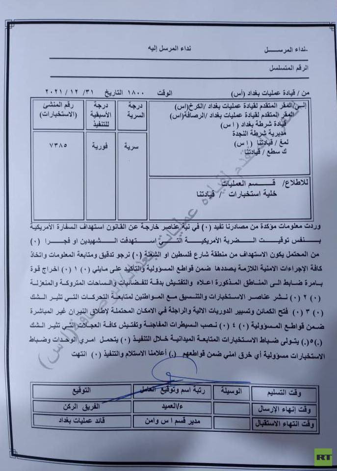 RT تحصل على وثيقة استخباراتية تشير إلى هجوم مرتقب على السفارة الأمريكية في بغداد - صورة