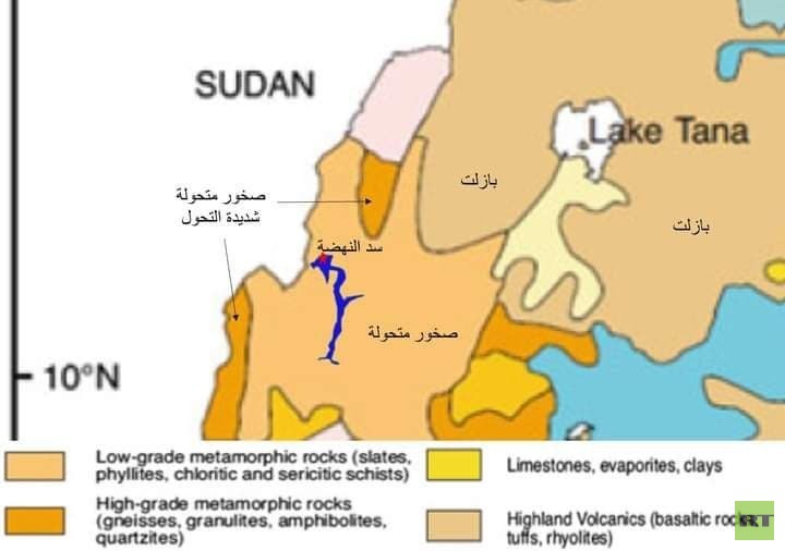 وقال: "تشغل الصخور البركانية البازلتية التي تشكل البراكين معظم الأراضي التي تقع في أحواض نهر النيل داخل إثيوبيا، وتقع أعلى صخور صلبة (نارية ومتحولة) وقليل من الصخور الرخوة (الرسوبية) مثل الحجر الرملي"، مشيرا إلى أن "منطقة سد النهضة منخفضة بالنسبة للهضبة الإثيوبية وهي عبارة عن صخور متحولة صلبة إلا أنها متشققة وتعاني كثير من التحلل بواسطة المحاليل الساخنة التى كونت بعض المعادن الاقتصادية مثل الذهب، ولذلك بحيرة سد النهضة سوف تغمر كثير من المناطق التعدينية".