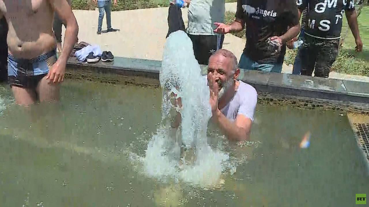 بالصور.. متظاهرون يستحمون في نافورة مجلس النواب العراقي