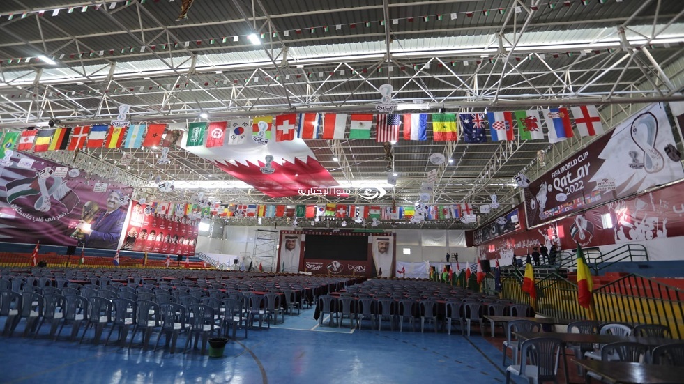 تجمع مئات المشجعين في قاعة رياضية في مدينة غزة، يوم الأحد، والتي أعدتها قطر للسكان الفلسطينيين في الأراضي الفقيرة لمشاهدة مباريات كأس العالم مجانا.