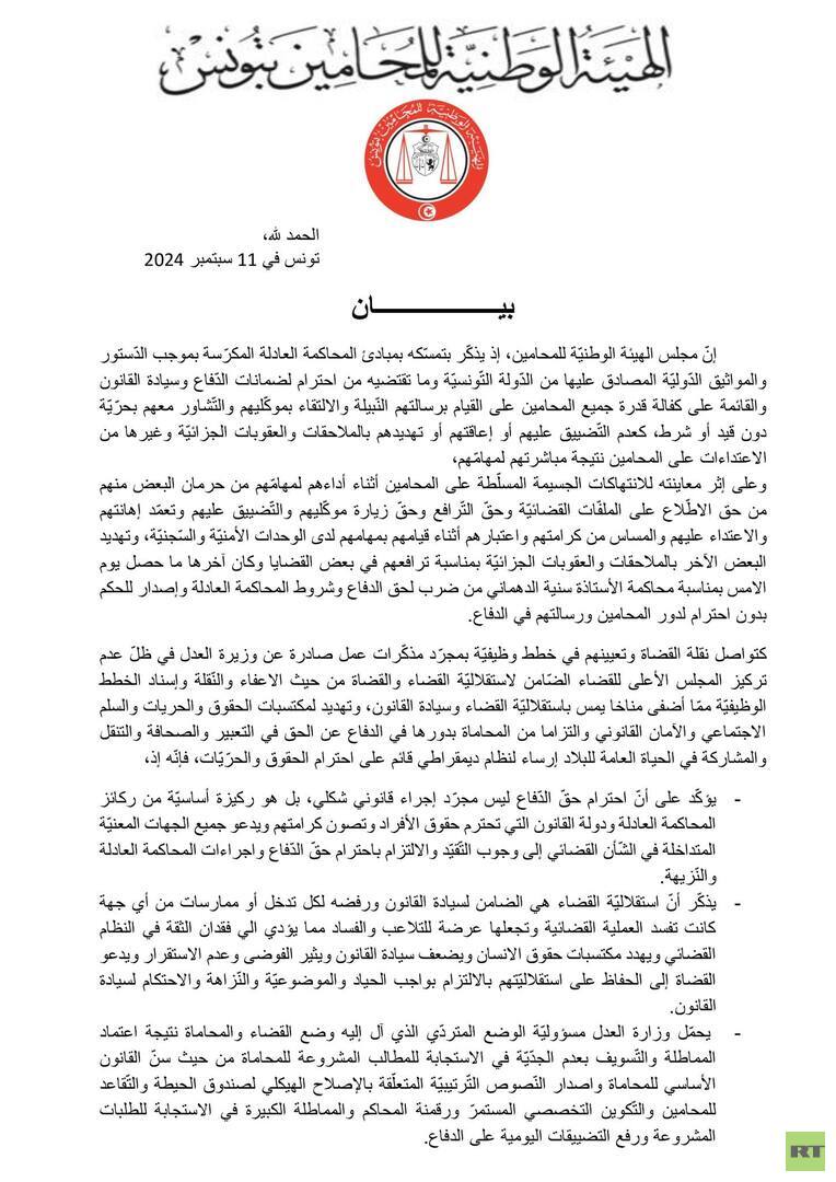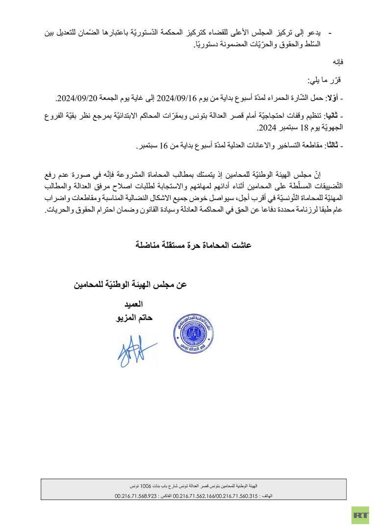وقالت الهيئة في بيان تلقت RT نسخة منه "إنها ستنظم وقفات احتجاجية أمام قصر العدالة بتونس وبمقرات المحاكم الإبتدائية بمرجع نظر بقية الفروع الجهوية يوم 18 سبتمبر بالإضافة إلى مقاطعة التساخير والإعانات العدلية لمدة أسبوع بداية من 16 سبتمبر وذلك للمطالبة باصلاح مرفق العدالة والاستجابة للمطالب المهنية للمحاماة التونسية في أقرب الآجال".