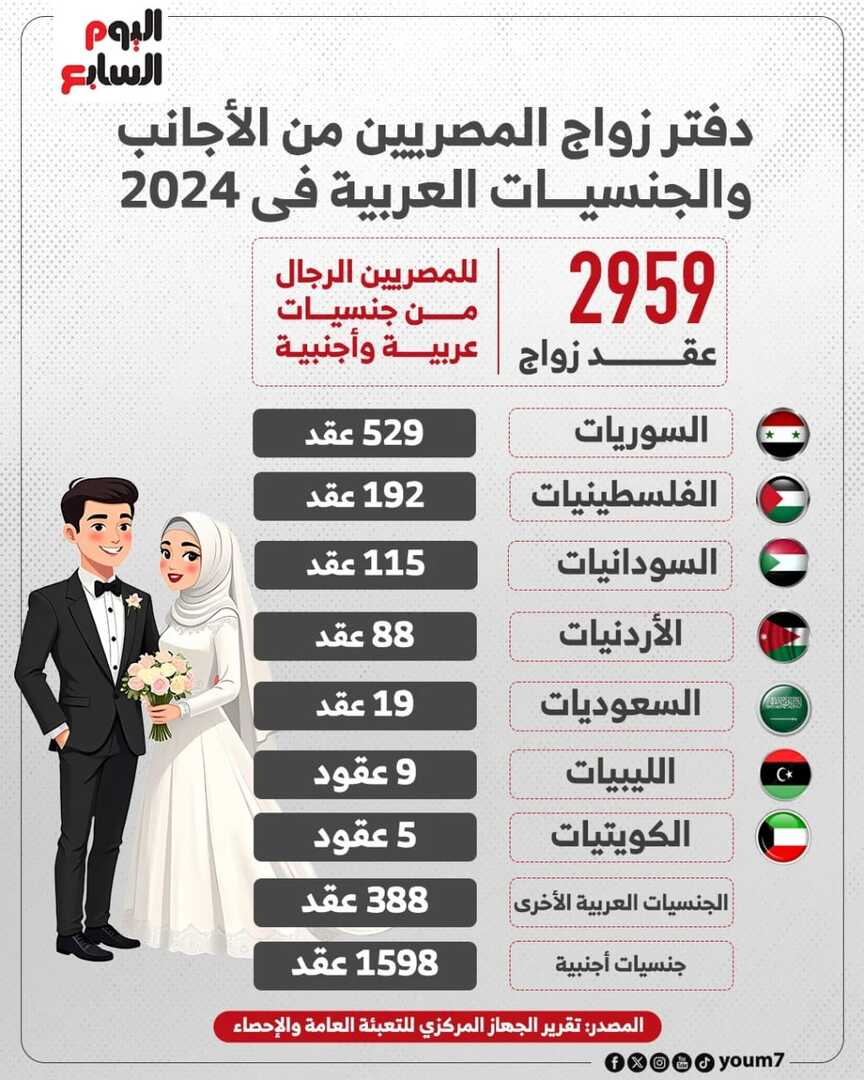 - جنسيات عربية أخرى: 696 عقد زواج، منها 388 عقدًا من مصريين، و146 عقدًا بين جنسيات عربية أخرى.