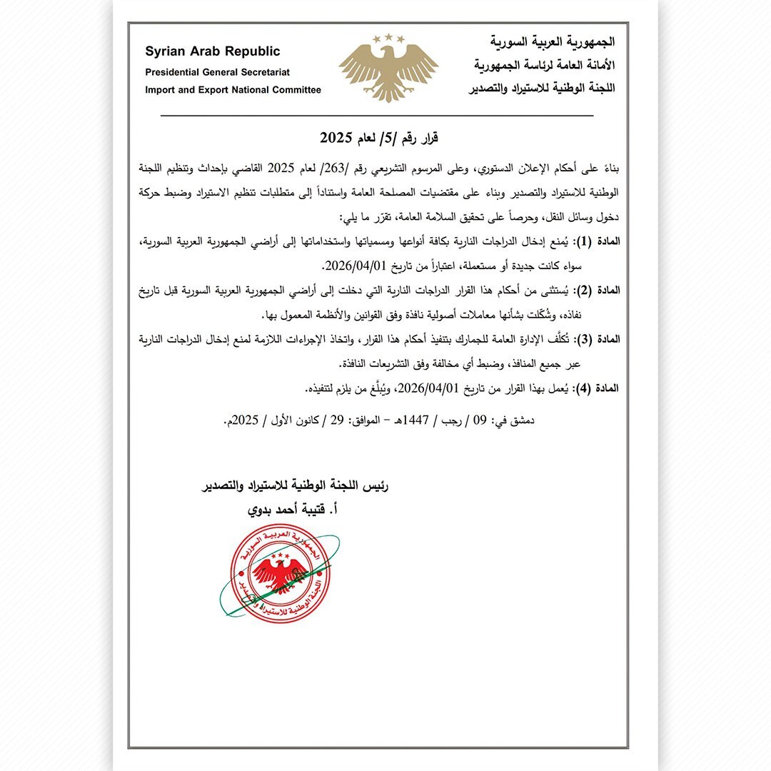 أصدرت اللجنة الوطنية للاستيراد والتصدير في سوريا قرارا، يوم الاثنين، يقضي بإيقاف استيراد الدراجات النارية بكافة أنواعها ومسمياتها واستخداماتها.