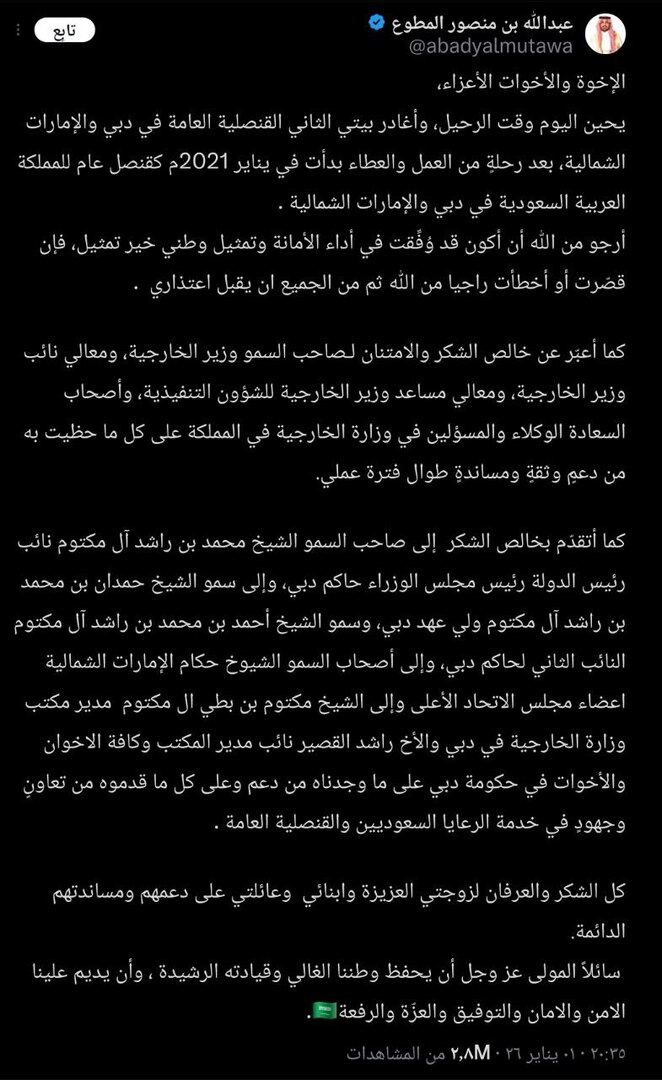 أعلن القنصل السعودي في دبي عبد الله المطوع، أمس الخميس، مغادرته منصبه، من دون أن يذكر الأسباب.