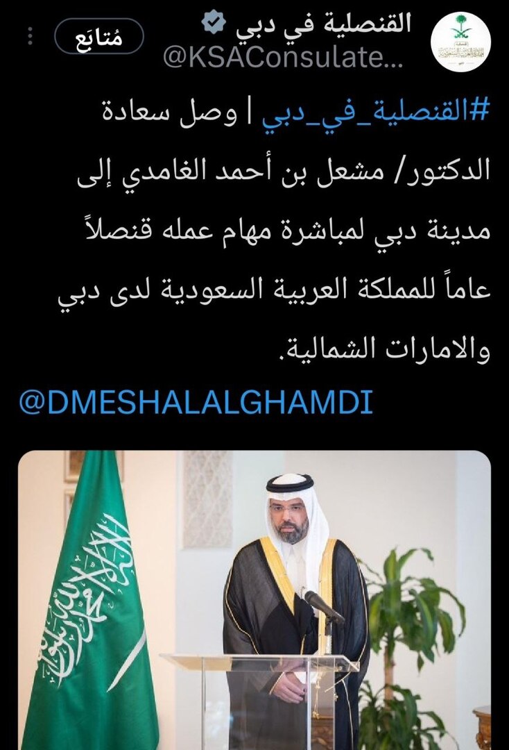 وجاء في منشور القنصلية على منصة "إكس": "وصل سعادة الدكتور مشعل بن أحمد الغامدي إلى مدينة دبي لمباشرة مهام عمله قنصلا عاما للمملكة العربية السعودية لدى دبي والإمارات الشمالية".