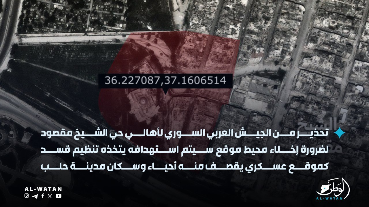 الجيش السوري ينذر بإخلاء مواقع في حي الشيخ مقصود بحلب قبل قصفها (صور)