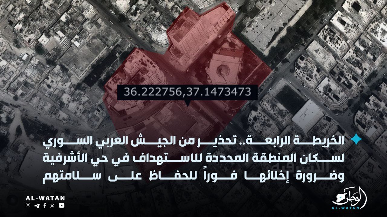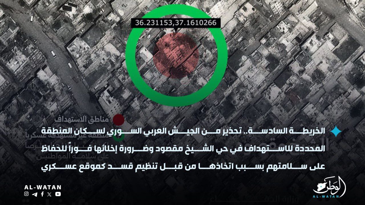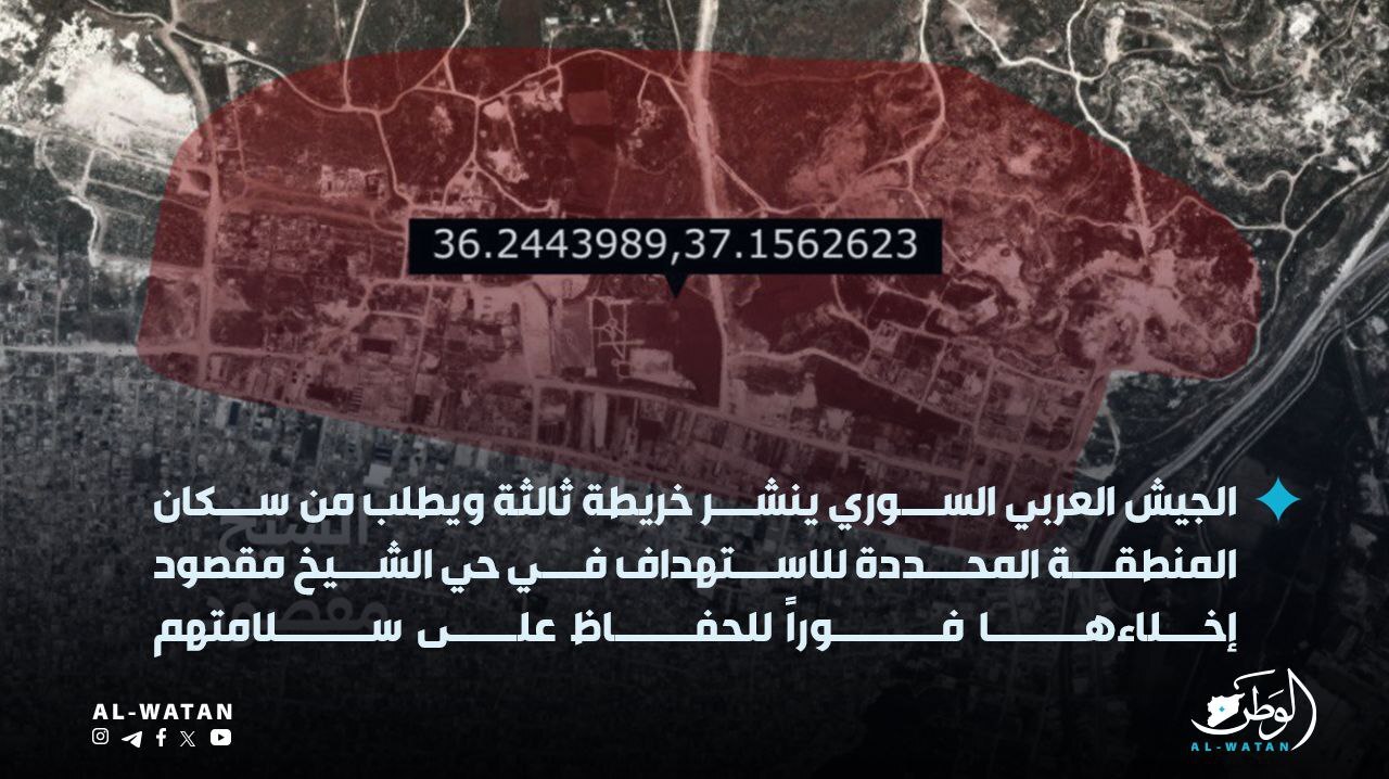 نشر الجيش السوري سلسلة من الخرائط يدعو فيها إلى إخلاء مواقع عسكرية في حي الشيخ مقصود بمدينة حلب، قال إنه سيتم استهدافه خلال الفترة المقبلة.