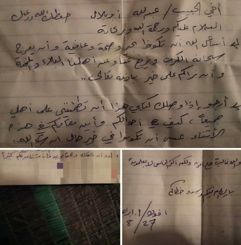تداول نشطاء مواقع التواصل الاجتماعي رسالة مكتوبة بخط اليد قالوا إنها تعود للناطق العسكري باسم "كتائب القسام" الراحل حذيفة الكحلوت المعروف باسم أبو عبيدة و"الملثم".