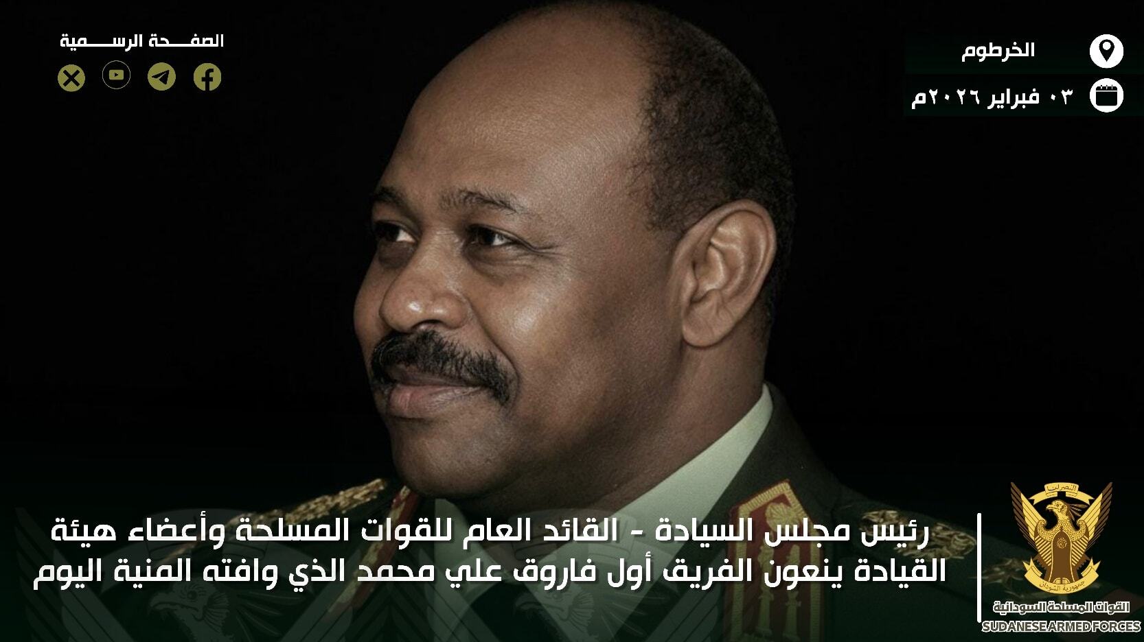 وذكر الجيش السوداني في بيان مساء الثلاثاء: "ينعى رئيس مجلس السيادة القائد العام للقوات المسلحة الفريق أول ركن عبد الفتاح البرهان، وأعضاء هيئة القيادة وجميع منسوبي القوات المسلحة عند الله تعالى، الفريق أول فاروق علي محمد الذي انتقل إلى جوار ربه اليوم الثلاثاء 3 فبراير 2026 بالعاصمة المصرية القاهرة".