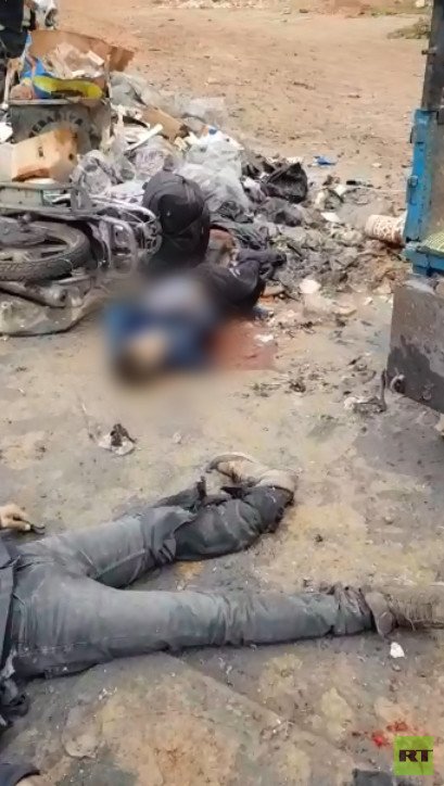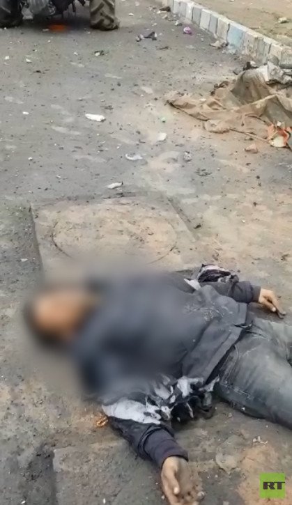 وبعثت المصادر بمقطع فيديو يبين جثث المدنيين منتشرة في موقع القصف. وتعتذر RT من متابعيها من عدم نشر الفيديو بسبب بشاعة المنظر وتكتفي بنشر صور منه.