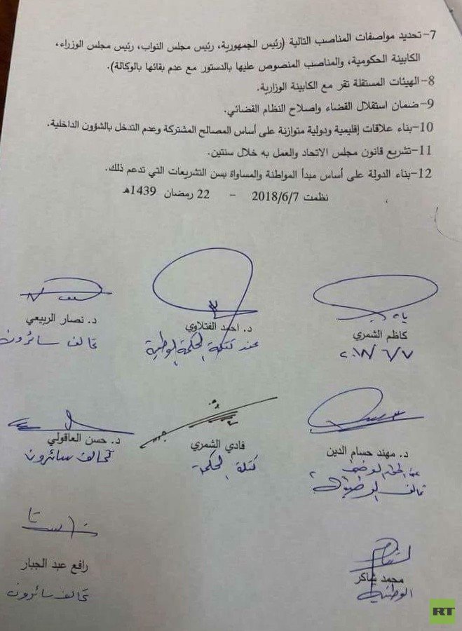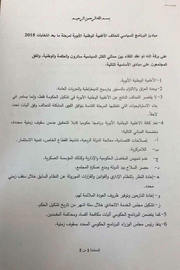 وحصل مراسلنا على نسخة من الاتفاق، الذي وصف التحالف الجديد بالـ "أبوي"، والذي سيمثل الكتلة الأكبر في البرلمان المقبل، مضيفا أن الاتفاق سينتظر المصادقة عليه عقب إعلان النتائج الانتخابية من قبل المحكمة الاتحادية (بعد إنهاء عملية إعادة الفرز اليدوي).