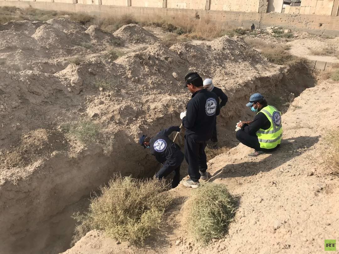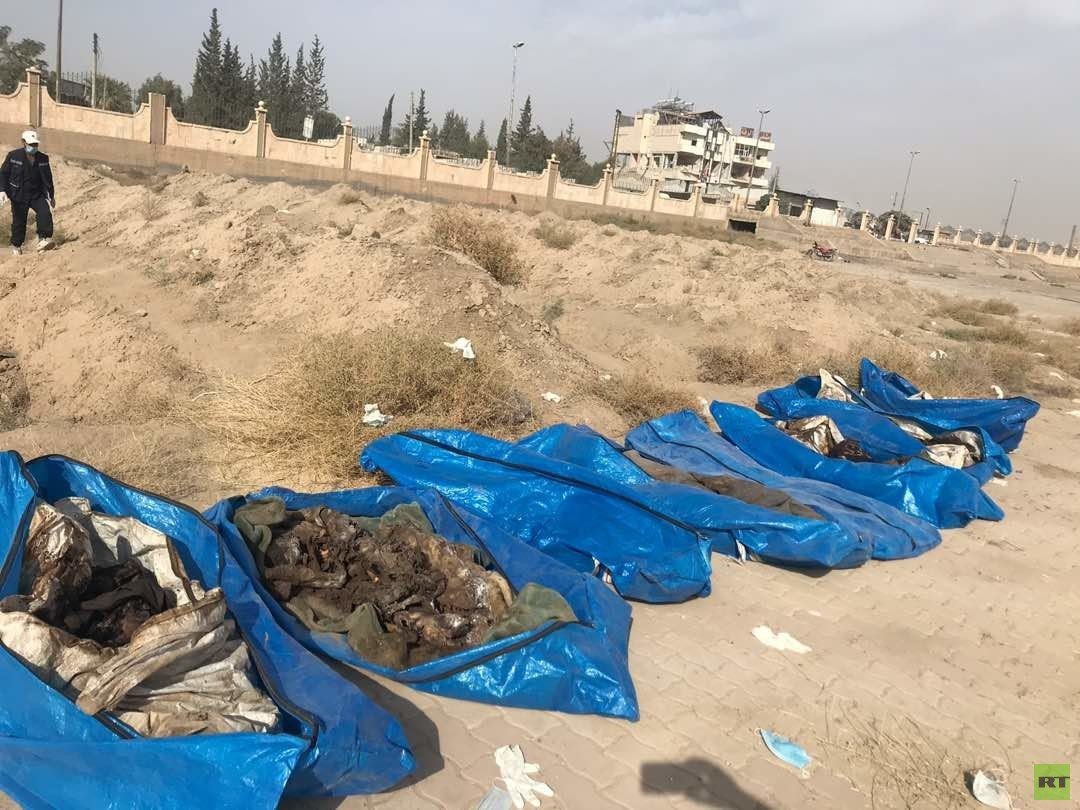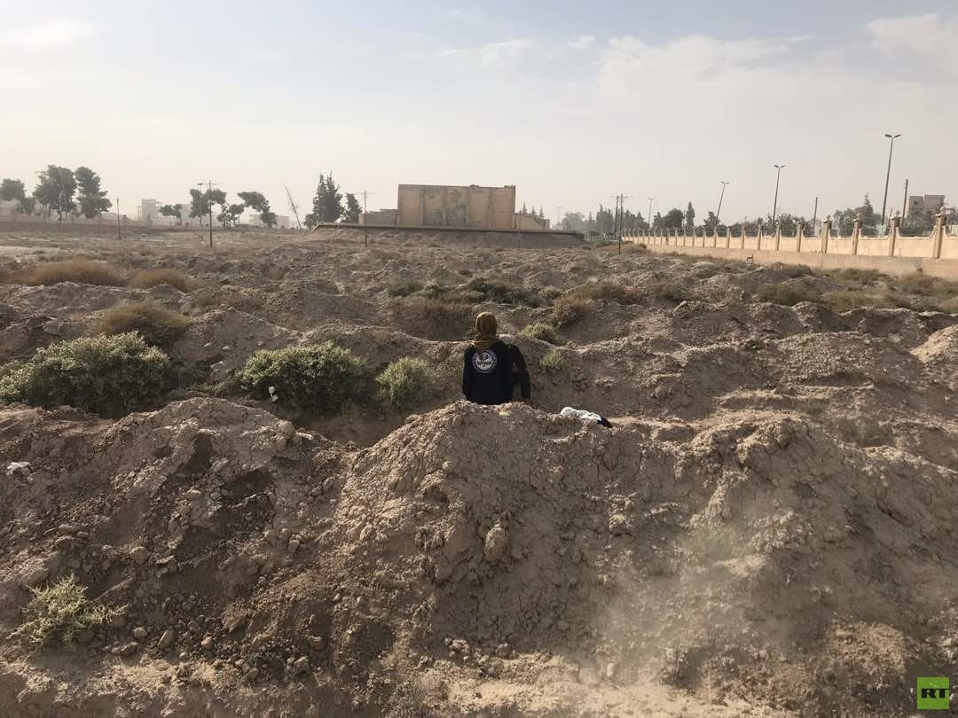 عدسة RT تجولت يوم الاثنين في أحدث مقبرة تم اكتشافها عند دوار البانوراما في الجهة الغربية الشمالية من مدينة الرقة، وثقت فظاعة ما ارتكبه تنظيم "داعش" في المنطقة.