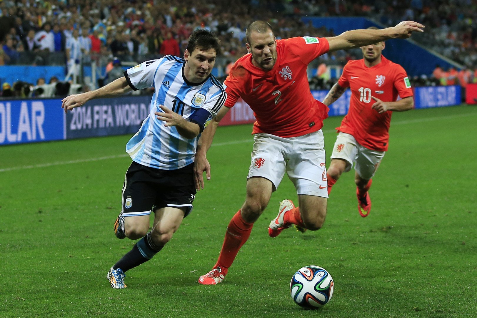 وكان فان غال مدرب هولندا مدرك تماما لخطورة ميسي وهيغواين في هجوم التانغو، ما دفعه للبدء بخطته المعتادة بخماسي في الخط الخلفي. أما شنايدر فقد نجح في رسم معالم خط الوسط البرتقالي، بينما منعة الدفاع الأرجنتيني من فتح المساحات للمهاجمين روبن وفان بيرسي.