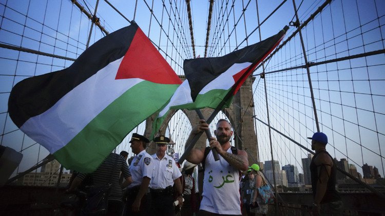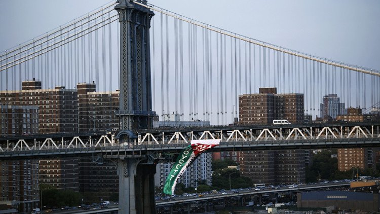 وسار المتظاهرون عبر الجسر الذي يربط بين منطقتي مانهاتن وبروكلين في مدينة نيويورك، وعلق نشطاء علما فلسطينيا عملاقا فوق الجسر كتب عليه "عقوبات، مقاطعة، سحب الاستثمارات".