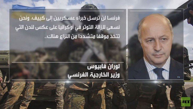 وفي موازاة ذلك أكد لوران فابيوس وزير الخارجية الفرنسي أن بلاده لن ترسل خبراء عسكريين إلى أوكرانيا، مشيرا إلى أن باريس تسعى لإزالة التوتر في أوكرانيا على عكس لندن التي تتخذ موقفا متشددا من النزاع هناك.
