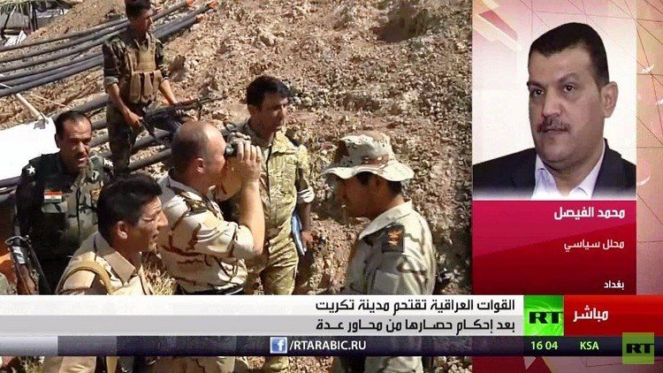 وذكر مصدر أمني في صلاح الدين الأربعاء أن القوات الأمنية وبإسناد من متطوعي الحشد الشعبي رفعت العلم العراقي فوق المستشفى العسكري وسط تكريت، الذي يقع في حي القادسية. وأشار مصدر إلى أن القوات الأمنية مع الحشد الشعبي دخلت منطقة القصور الرئاسية شرق تكريت، من محورين.
