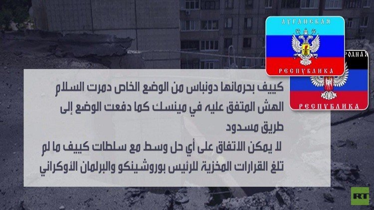 وجاء في بيان مشترك صادر عن ألكسندر زاخارتشينكو وإيغور بلوتنيتسكي رئيسي الجمهوريتين المعلنتين من جانب واحد في شرق أوكرانيا: "كييف بحرمانها دونباس من الوضع الخاص دمّرت السلام الهش (الذي تم التوصل إلى الاتفاق بشأنه في مينسك) ودفعت الوضع إلى طريق مسدود"، حسبما نقل مركز لوغانسك الإعلامي يوم الأربعاء.