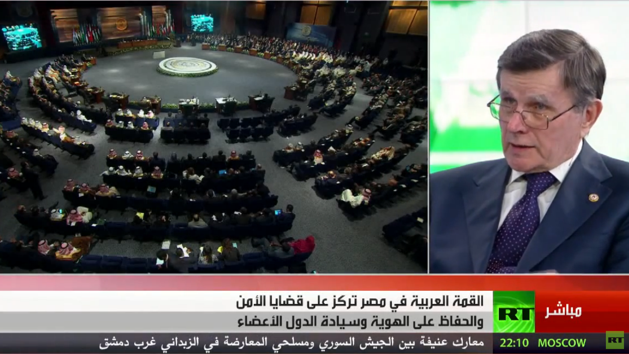 استضافت قناة RT فيتشسلاف ماتوزف رئيس الجمعية الروسية للصداقة والتعاون مع البلدان العربية للحديث حول ملفات الشرق الأوسط، التي نوقشت في القمة العربية الـ26 في شرم الشيخ.