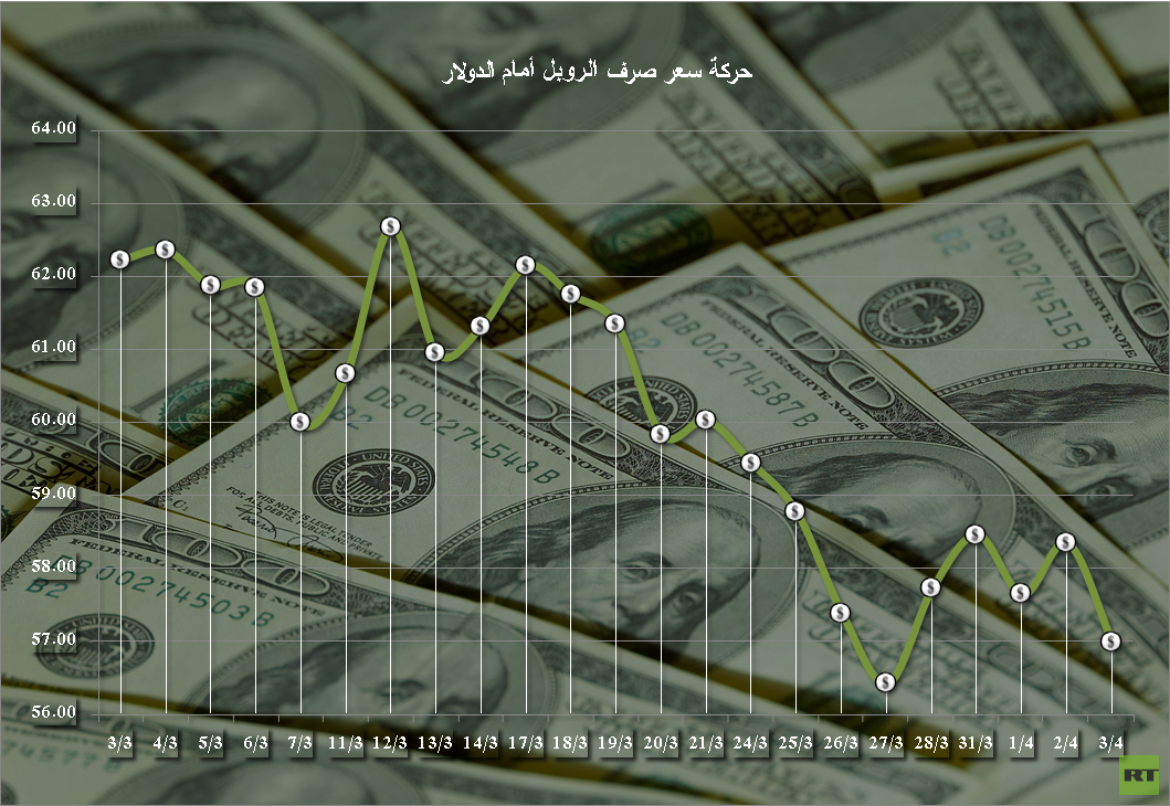 وفيما يتعلق بسعر الصرف الرسمي للدولار أمام الروبل، فحدد من قبل المركزي الروسي ليوم الجمعة 3 أبريل/نيسان 2015 عند مستوى 56.9902 روبل للدولار.