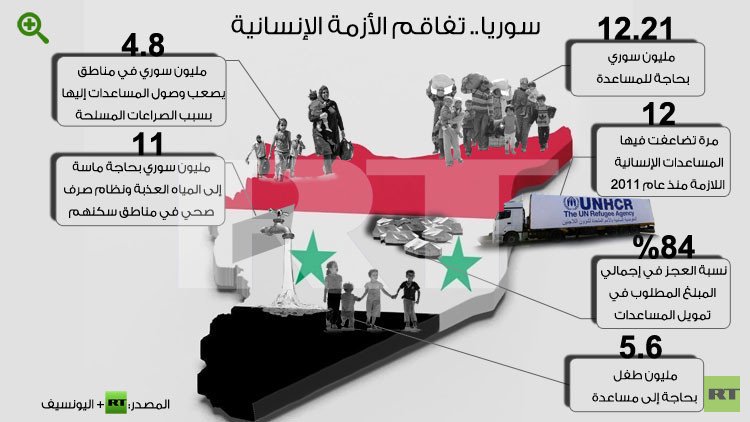 وحسب التقرير الصادر في شهر فبراير/شباط فإن المساعدات الإنسانية اللازمة تضاعفت 12 مرة منذ بداية الأزمة السورية، ووصل عدد السوريين الذين يحتاجون لمساعدة إنسانية إلى 12.21 مليون سوري، أي ما يعادل نصف تعداد الشعب السوري تقريباً. ويقصد بالمساعدات الإنسانية هنا مقومات الحياة الأساسية من غذاء وماء ودواء وملبس ومسكن وتعليم. ويضاف إلى هذه المأساة الإنسانية فجوة ضخمة في تمويل حملة المساعدات تصل إلى 84% من المجموع الكلي المطلوب.
