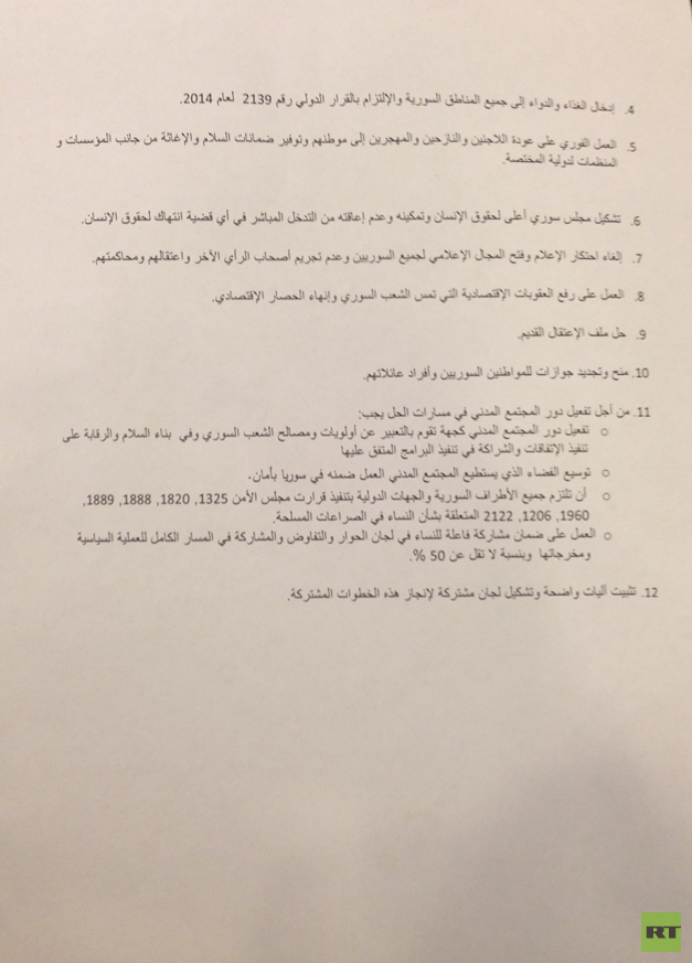 ودعا البيان أيضا إلى الحفاظ على وحدة سوريا وسيادتها واستقلالها وضرورة التصدي للإرهاب وعدم السماح بالتدخل الخارجي والحفاظ على مؤسسات الدولة، لكن عددا من شخصيات وفد المعارضة تحفظت على بعض بنود البيان.