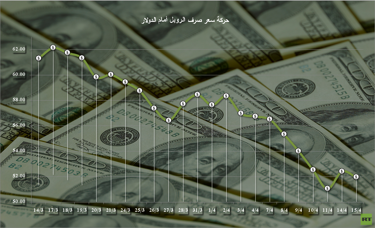 صعد سعر صرف الروبل أمام الدولار واليورو في تعاملات بورصة موسكو الثلاثاء 14 أبريل/نيسان، على خلفية ارتفاع أسعار النفط في الأسواق العالمية.