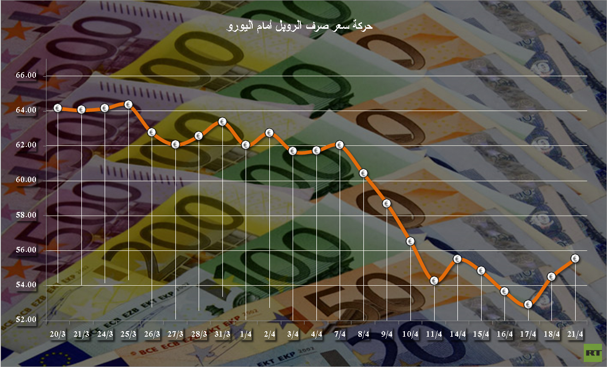تراجعت العملة الروسية الروبل أمام الدولار واليورو يوم الاثنين 20 أبريل/نيسان، بعد أن قرر البنك المركزي الروسي رفع الحد الأدنى لأسعار الفائدة لمزادات العملة الأجنبية.