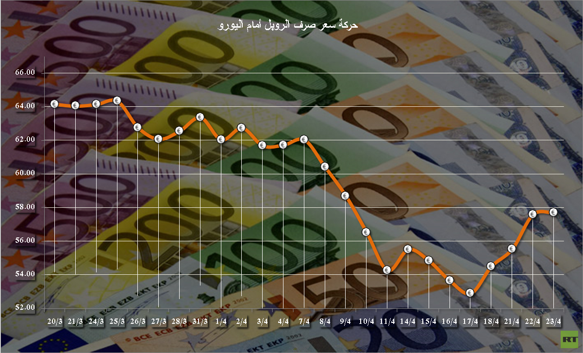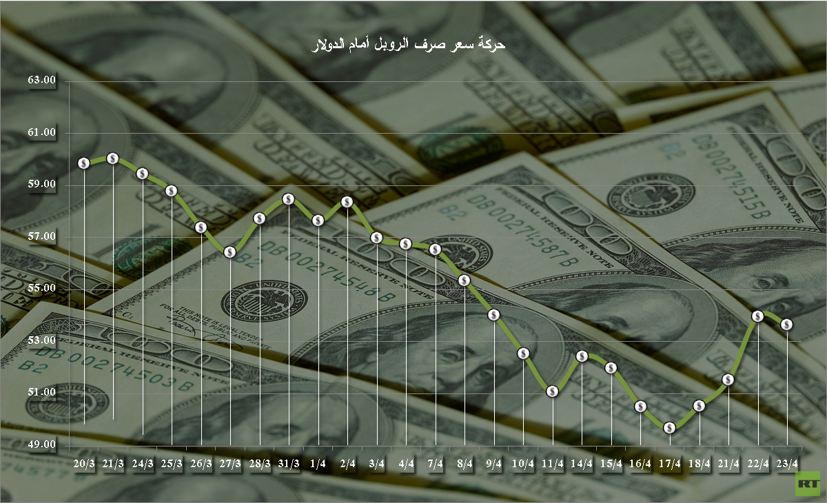 ارتفع سعر صرف الروبل أمام الدولار واليورو خلال تعاملات الأربعاء 22 أبريل/نيسان، حيث تراجع الدولار إلى ما دون مستوى 53 روبلا، وانخفض اليورو إلى ما دون مستوى 57 روبلا.