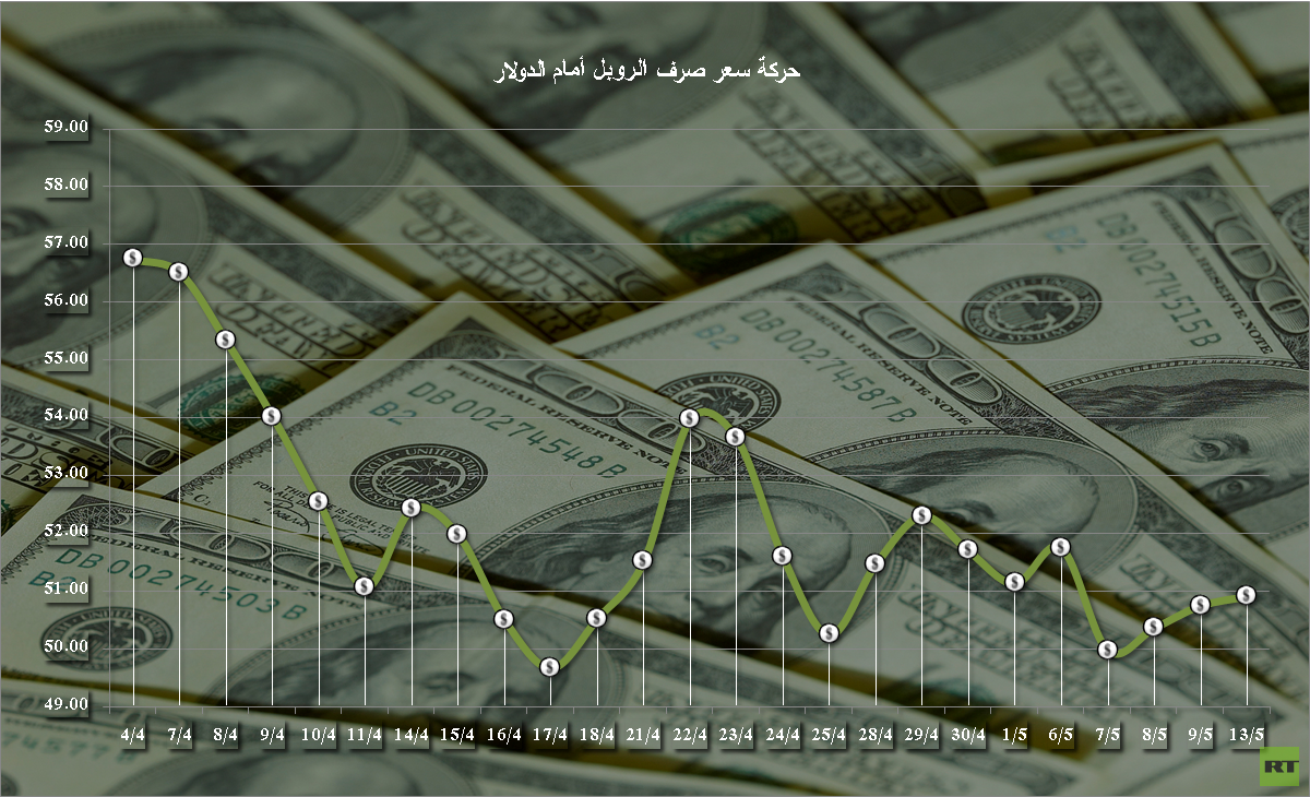 وحدد المصرف المركزي الروسي سعر صرف الدولار الرسمي ليوم الأربعاء 13 مايو/أيار عند مستوى 50.914 روبل.