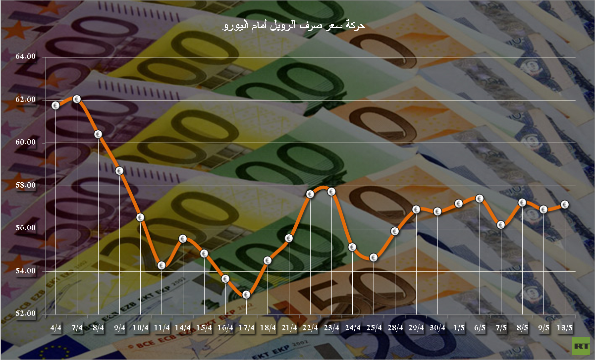 ارتفع سعر صرف الروبل الروسي أمام الدولار واليورو يوم الثلاثاء 12 مايو/أيار، وسط توقعات بتراجع حدة المخاطر الجيوسياسية في المنطقة وارتفاع أسعار النفط في الأسواق العالمية.