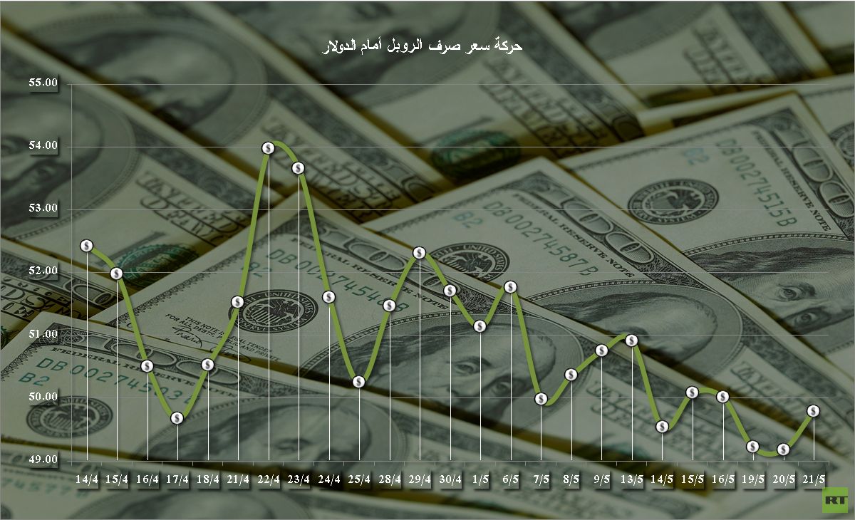 وارتفع سعر صرف الدولار مقابل الروبل في التعاملات الفورية نحو مستوى 50 روبلا، حيث سجل الدولار بحلول الساعة 14:44 بتوقيت موسكو قراءة عند مستوى 49.97 روبل، مرتفعا بنسبة 0.48% ما يعادل 24 كوبيكا (الروبل = 100 كوبيك) عن مستوى الإغلاق السابق.