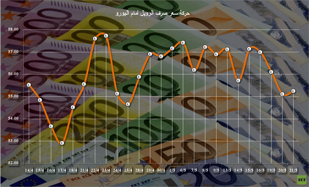 وصعدت العملة الموحدة لمنطقة اليورو مقابل الروبل بنسبة 0.61% ما يعادل 33 كوبيكا إلى 55.46 روبل.