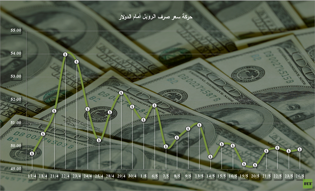 وحدد المصرف المركزي الروسي سعر صرف الدولار الرسمي ليوم الثلاثاء 26 مايو/أيار 2015 عند مستوى 49.8613 روبل.