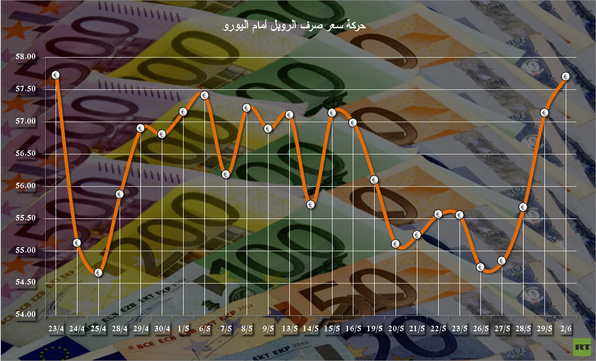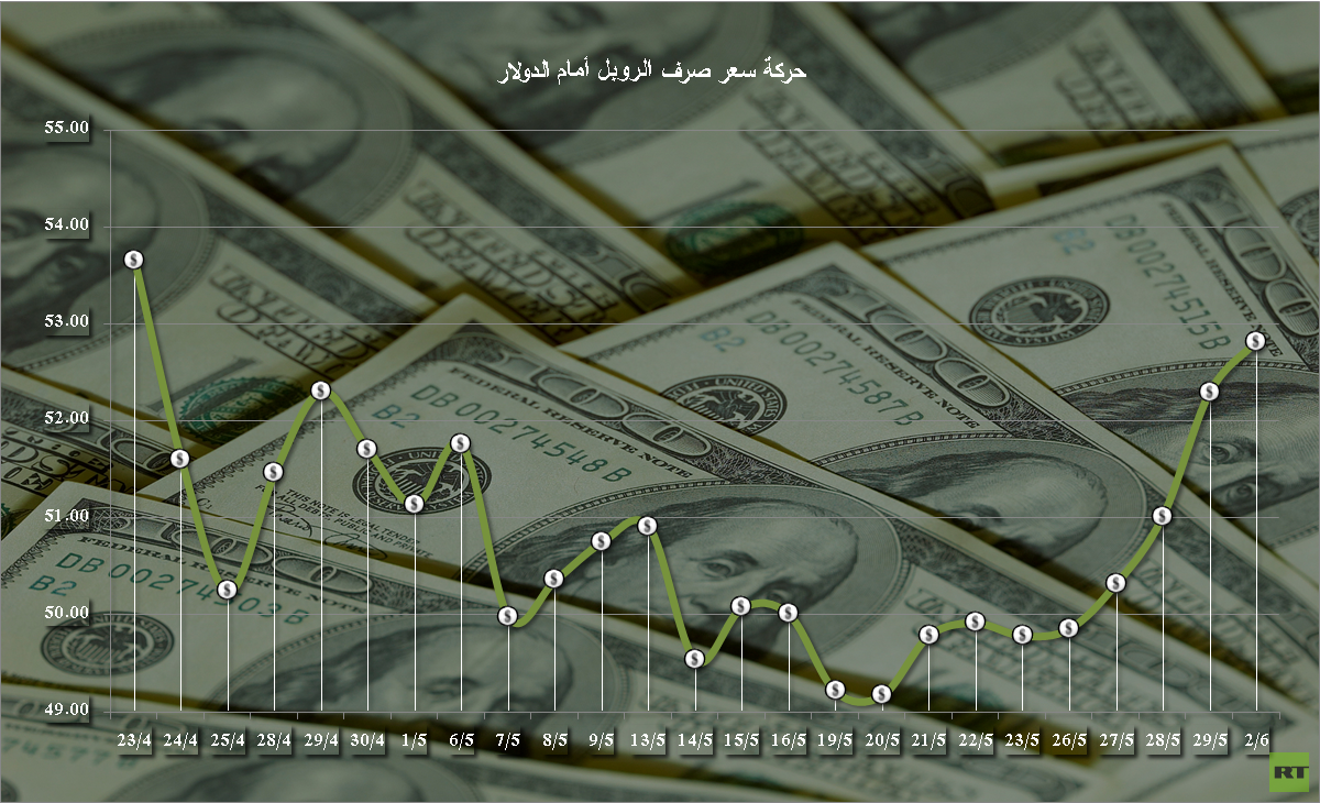 صعد سعر صرف الدولار واليورو مقابل الروبل الروسي خلال تعاملات الاثنين 1 يونيو/حزيران لليوم الثاني على التوالي، مسجلين مستويات قياسية عليا.