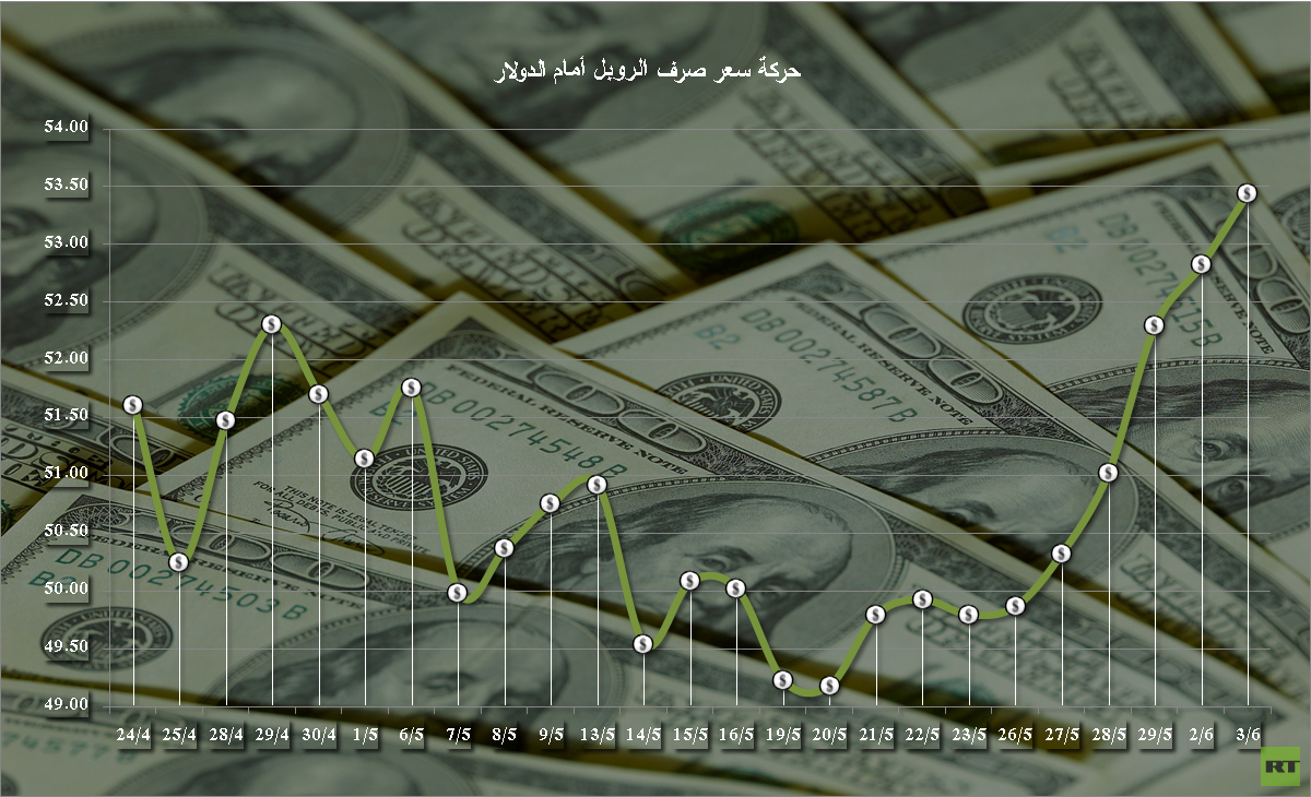 وحدد المصرف المركزي الروسي سعر صرف الدولار الرسمي ليوم الأربعاء 3 يونيو/حزيران 2015 عند مستوى 53.4413 روبل.