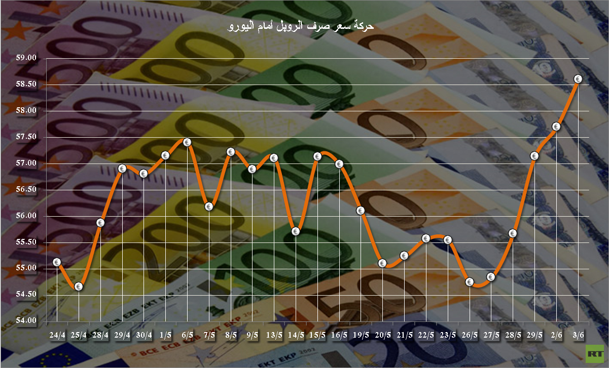 ارتفع الروبل الروسي مقابل الدولار خلال تداولات الثلاثاء 2 يونيو/حزيران، معوضا بعض الخسائر التي مني بها في الآونة الأخيرة، بينما تراجع أمام اليورو.