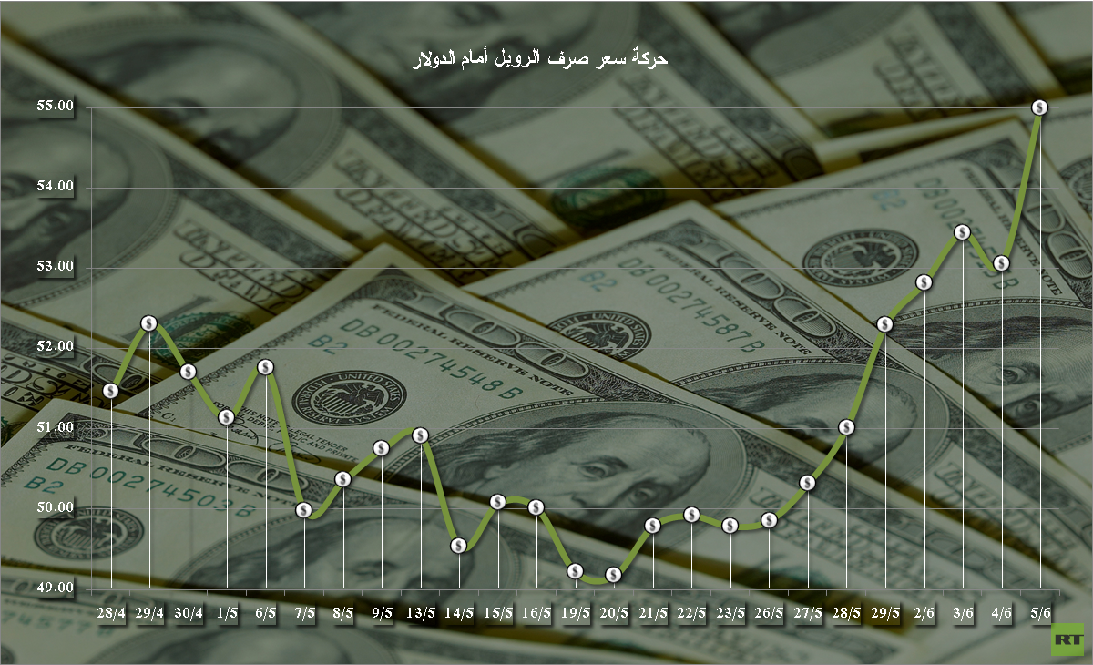 ارتفع سعر صرف كل من الدولار واليورو مقابل الروبل الروسي الخميس 4 يونيو/حزيران إلى أعلى مستوى في شهرين، على خلفية هبوط أسعار النفط وزيادة حدة التوترات الجيوسياسية والاقتصادية.