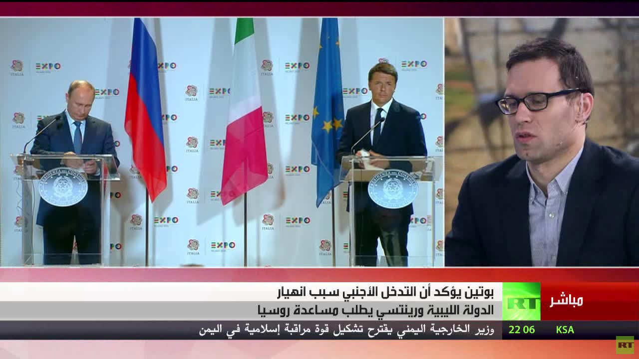 وقال بوتين في مؤتمر صحفي مشترك مع رئيس الوزراء الإيطالي ماتيو رينزي في ميلانو يوم الأربعاء 10 يونيو/حزيران، "نحن على قناعة بأن ما يجري حاليا في الواقع من تفكك الدولة الليبية هو نتيجة التدخل العسكري الخارجي في عام 2011".