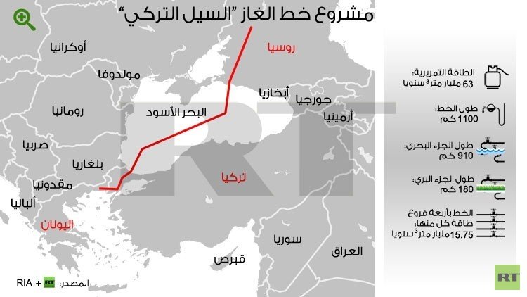 وكانت "غازبروم" قد وقعت مع شركة "بوتاس" التركية في الأول من ديسمبر/كانون الأول 2014، مذكرة تفاهم لبناء خط أنابيب لنقل الغاز بسعة تبلغ 63 مليار متر مكعب من الغاز سنويا من روسيا إلى تركيا، ومن المفترض أن يبلغ طول خط الأنابيب نحو 1100 كيلومتر، وأن يضخ نحو 47 مليار متر مكعب من الغاز إلى الحدود التركية اليونانية.