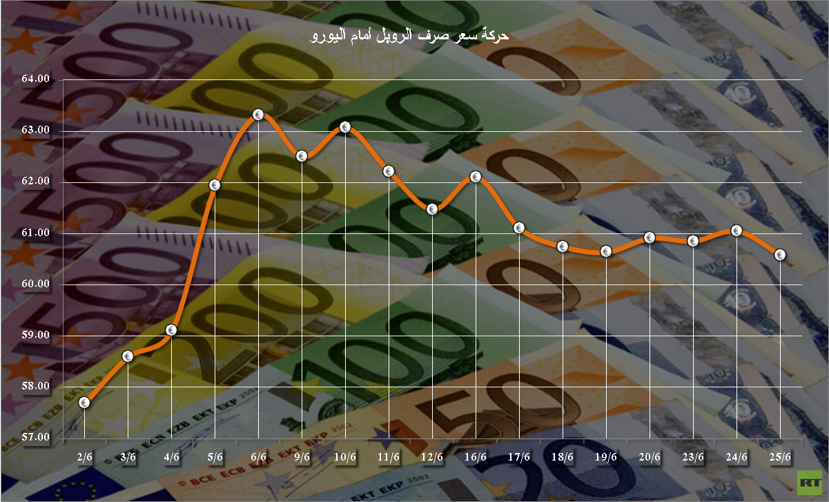 تراجع سعر صرف الروبل الروسي مقابل الدولار واليورو يوم الأربعاء 24 يونيو/حزيران، وسط مخاوف من زعزعة الأسواق المالية بسبب أزمة ديون اليونان وتوقعات بعدم استقرار أسواق النفط.
