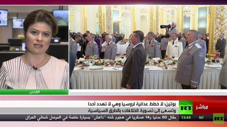 وقال الرئيس بوتين في حفل تخرج طلاب الكليات والمعاهد العسكرية الروسية الخميس 25 يونيو/حزيران إن "روسيا بلد منفتح على العالم يسعى لتعزيز التعاون والشراكة مع جميع من يبدي استعدادا لذلك، ولا توجد لدينا ولا يمكن أن توجد أي خطط عدائية، نحن لا نهدد أحدا، ونسعى إلى تسوية كل الخلافات بالطرق السياسية فقط، ونحترم القانون الدولي ومصالح الدول الأخرى".